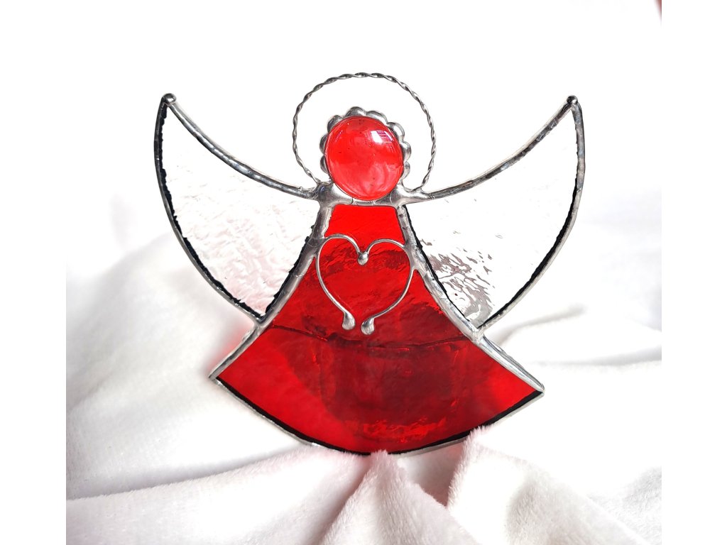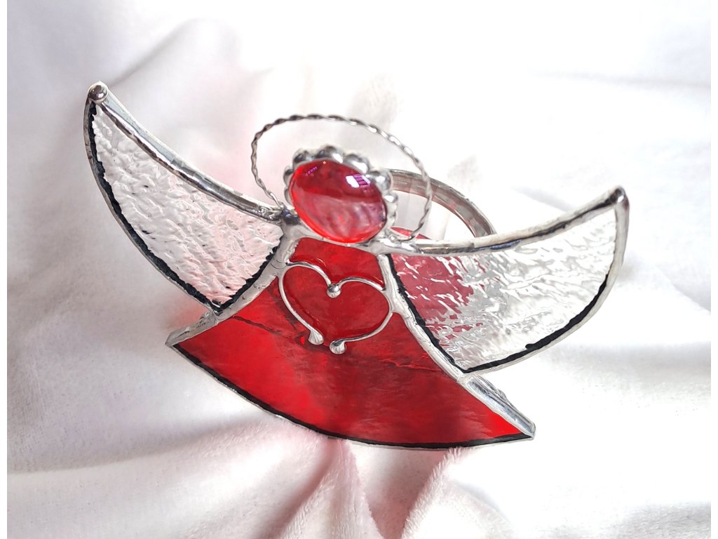 Anděl svícen vitráž na čajovou svíčku, jehož skleněný kalíšek je připevněn k andílkovi, který je světlem prosvícen.