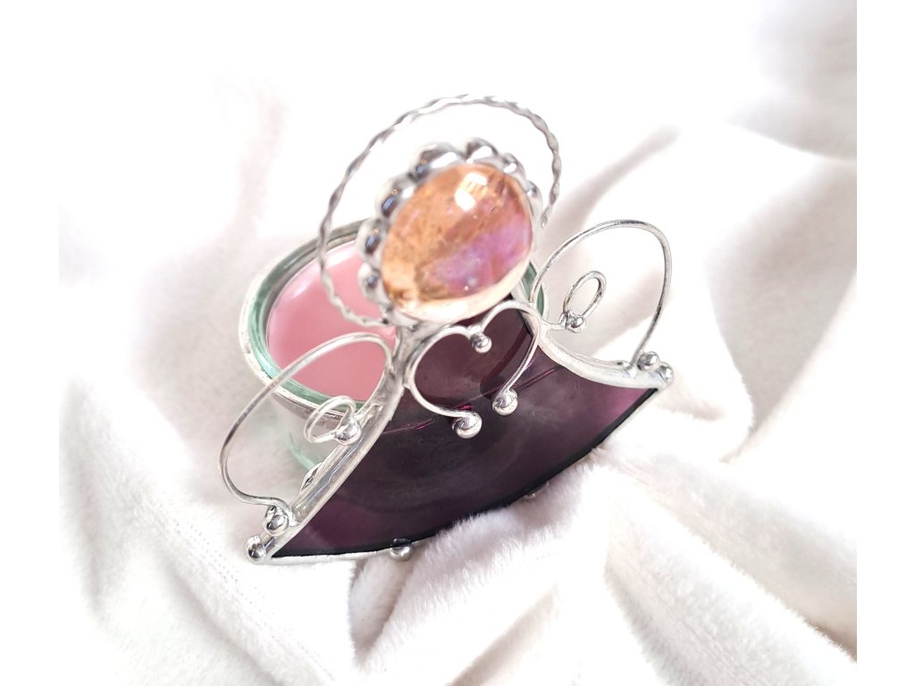 Anděl svícen vitráž na čajovou svíčku, jehož skleněný kalíšek je připevněn k andílkovi, který je světlem prosvícen.