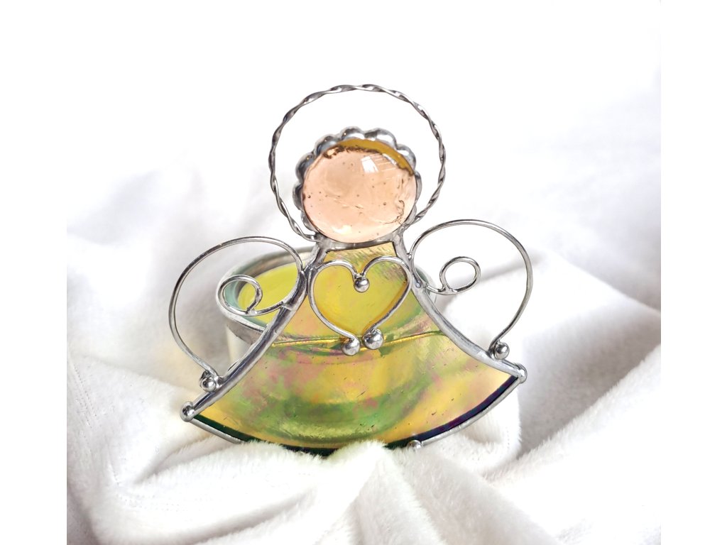 Anděl svícen vitráž na čajovou svíčku, jehož skleněný kalíšek je připevněn k andílkovi, který je světlem prosvícen.