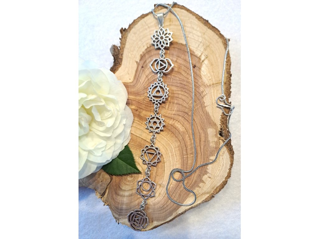 Náhrdelník čakrové symboly 13cm, délka řetízku 44 cm, bílý kov (může obsahovat nikl)